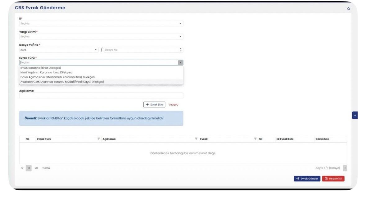 UYAP Avukat Portalı > Evrak Gönderme İşlemleri > CBS Evrak Gönderme menüsünde, evrak türü olarak "Avukatın CMK Uyarınca Zorunlu Müdafi/Vekil Kaydı Dilekçesi" seçeneği eklenmiştir.